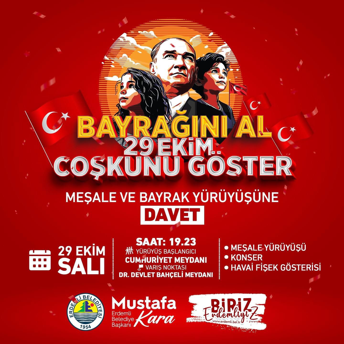 Cumhuriyet Meydanı’ndan başlayarak Meşale ve Bayrak yürüyüşünü gerçekleştireceğimiz, Cumhuriyet konseri ve havai fişek gösterilerinin de yer alacağı Cumhuriyet Bayramı Kutlamalarında buluşalım.